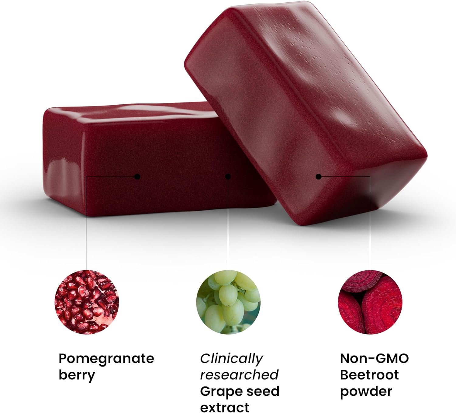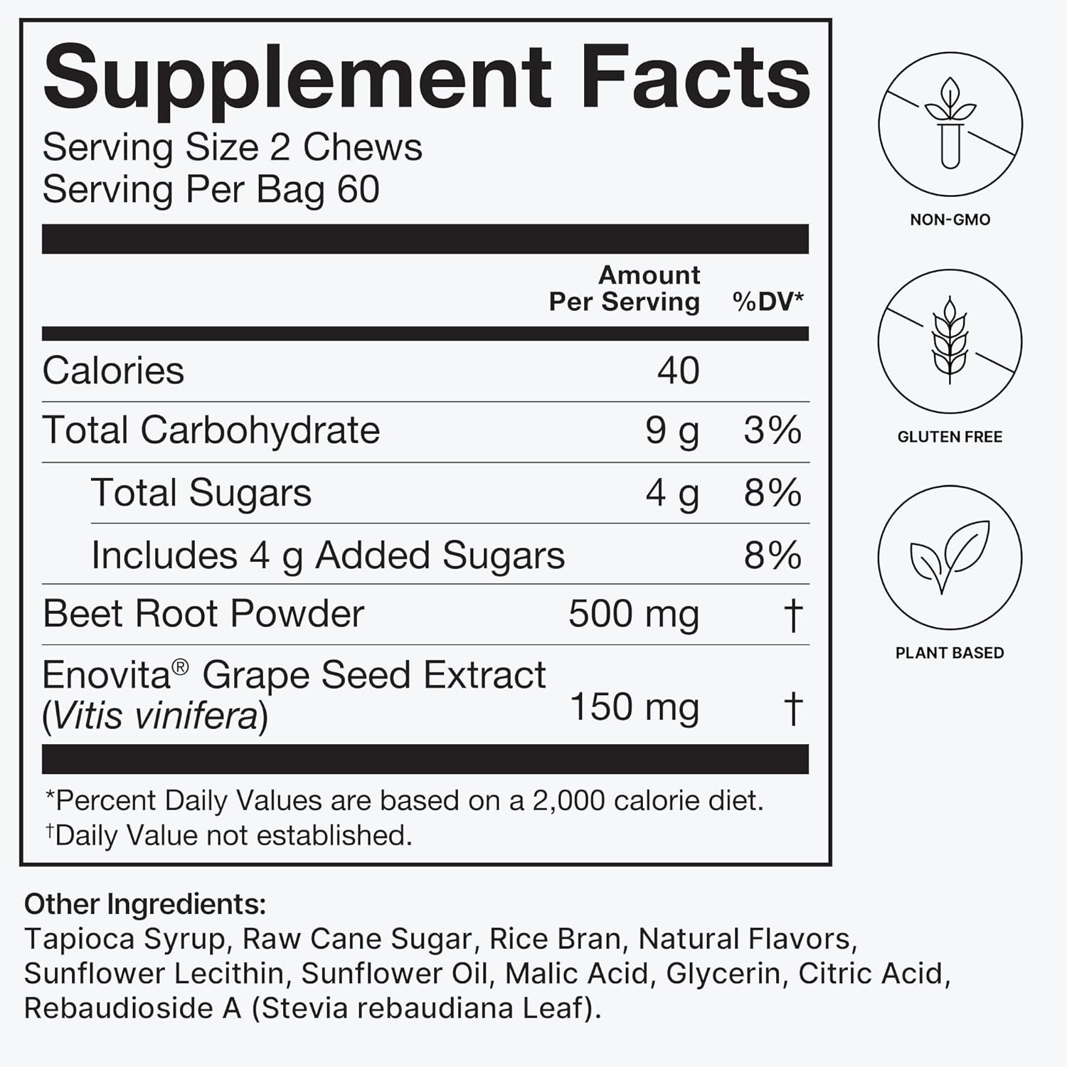 Non-GMO Beetroot Powder, Enovita Grape Seed Extract; Other Ingredients: Tapioca Syrup, Raw Cane Sugar, Rice Bran, Natural Flavors, sunflower Lecithin, Sunflower oil, Malic Acid, Glyerin, Citric Acid, Rebaudioside A (Stevia rebaudiana leaf)