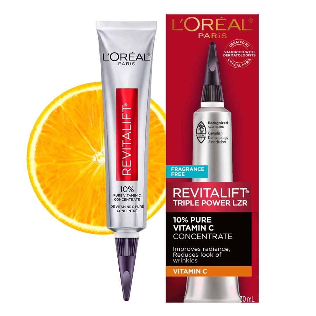 L’Oreal Paris Revitalift Derm Intensives Vitamin C Serum visibly boosts skin’s youthful radiance in 1 week. Validated in partnership with dermatologists, this lightweight, yet highly potent 10% Pure Vitamin C Serum effortlessly glides onto skin, leaving it velvety soft and powerfully radiant. The cream formula quickly absorbs to even skin t1, reduce wrinkles, and give your skin a matte look, perfect to use before your face cream moisturizer and make up. Vitamin C is a vital antioxidant naturally found in skin, proven to boost radiance and neutralize free radicals that lead to skin aging. This powerful but highly unstable molecule degrades when exposed to air, light or water. To maximize potency and stability, our Vitamin C serum was specially formulated without water, packaged in an air-tight metal tube sealed until ready to use, and produced in controlled conditions to minimize oxygen exposure.Fragrance free. Paraben free. Allergy Tested. No mineral oil or synthetic dyes. Suitable for sensitive skin. For best results, use before Triple Power Face Moisturizer.Solutions for Uneven Skin T1, Dullness, Wrinkles, Anti-Aging.