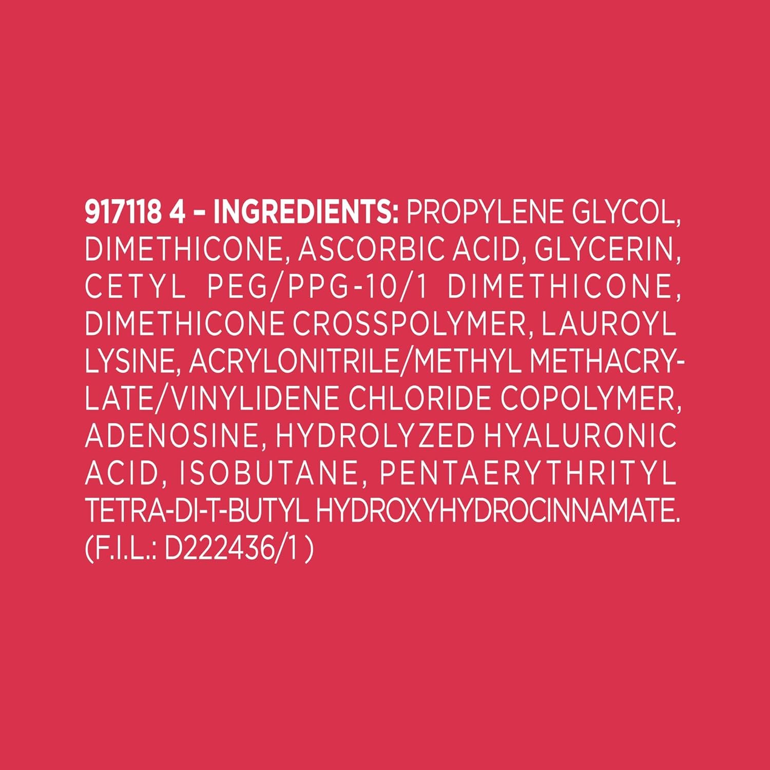 Formula 917118/4 Revitalift Derm Intensives Pure Vitamin C Serum INGREDIENTS PROPYLENE GLYCOL DIMETHICONE ASCORBIC ACID GLYCERIN CETYL PEG/PPG-10/1 DIMETHICONE DIMETHICONE CROSSPOLYMER LAUROYL LYSINE ACRYLONITRILE/METHYL METHACRYLATE/VINYLIDENE CHLORIDE COPOLYMER ADENOSINE HYDROLYZED HYALURONIC ACID ISOBUTANE PENTAERYTHRITYL TETRA-DI-T-BUTYL HYDROXYHYDROCINNAMATE FIL CODE D222436/1