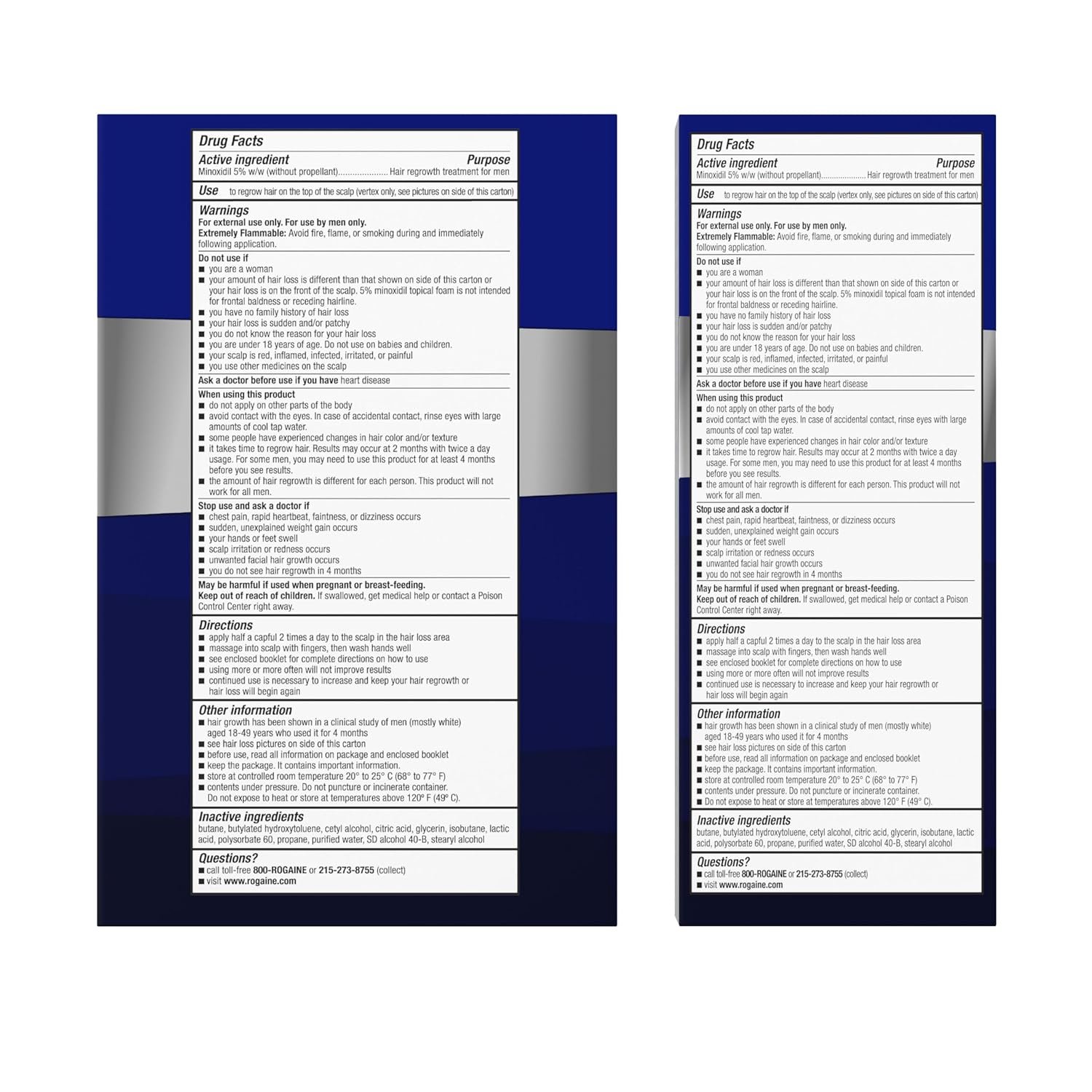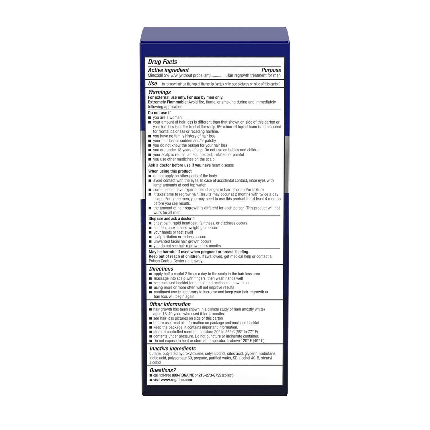 For external use only. For use by men only. Extremely Flammable: Avoid fire, flame, or smoking during and immediately following application. Do not use if You are a woman Your amount of hair loss is different than that shown on side of this carton or your hair loss is on the front of the scalp. 5% minoxidil topical foam is not intended for frontal baldness or receding hairline. You have no family history of hair loss Your hair loss is sudden and/or patchy You do not know the reason for your hair loss You are under 18 years of age. Do not use on babies and children. Your scalp is red, inflamed, infected, irritated, or painful You use other medicines on the scalp Ask a doctor before use if you have heart disease When using this product Do not apply on other parts of the body Avoid contact with the eyes. In case of accidental contact, rinse eyes with large amounts of cool tap water. Some people have experienced changes in hair color and/or texture It takes time to regrow hair. Results may occur at 2 months with twice a day usage. For some men, you may need to use this product for at least 4 months before you see results. The amount of hair regrowth is different for each person. This product will not work for all men. Stop use and ask a doctor if Chest pain, rapid heartbeat, faintness, or dizziness occurs Sudden, unexplained weight gain occurs Your hands or feet swell Scalp irritation or redness occurs Unwanted facial hair growth occurs You do not see hair regrowth in 4 monthsMay be harmful if used when pregnant or breast-feeding. Keep out of reach of children. If swallowed, get medical help or contact a Poison Control Center right away.