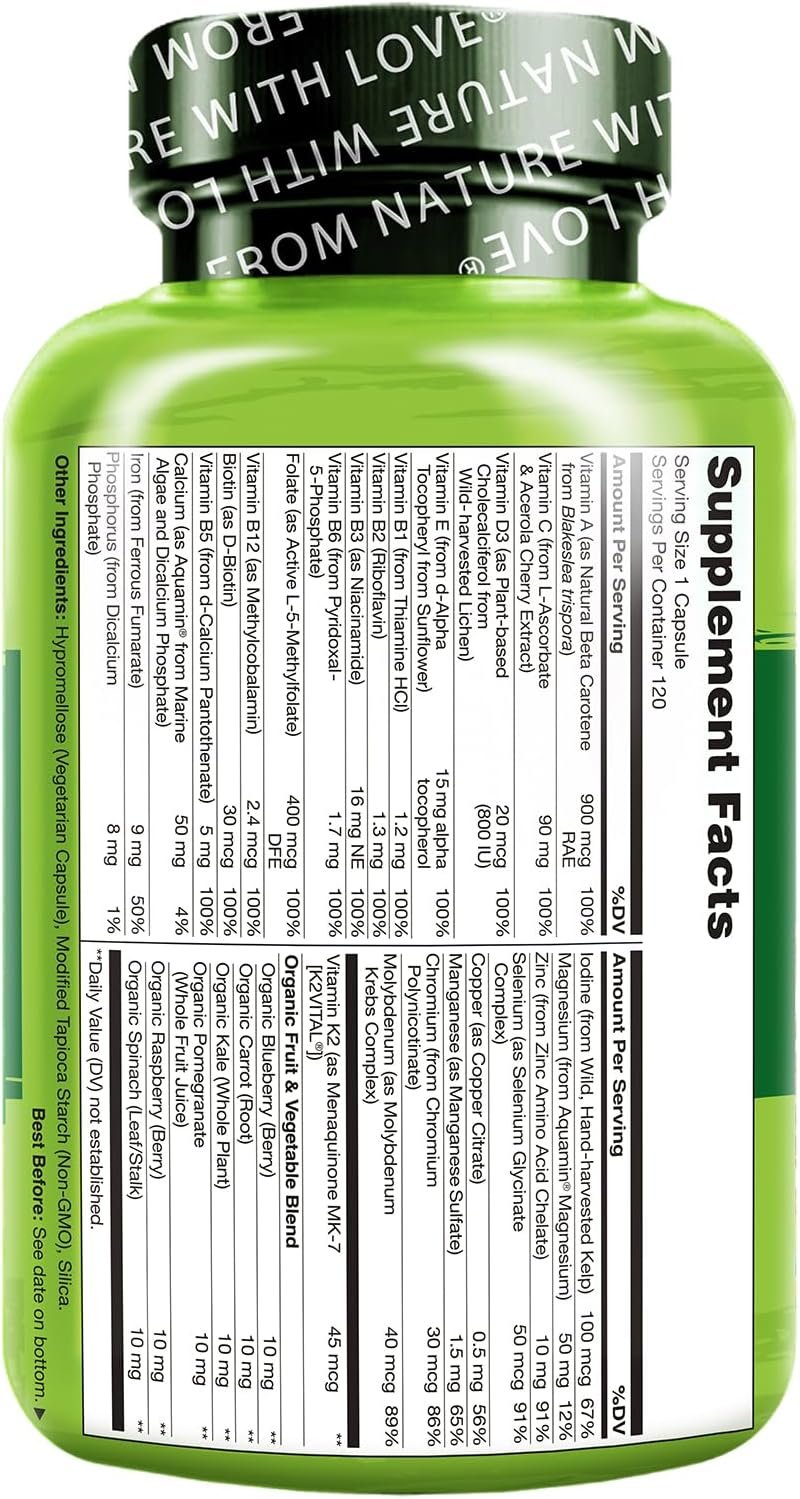 Vitamin A (as Beta-Carotene from Blakeslea Trispora) 900 mcg 100%, Vitamin C (from L-Ascorbate and Acerola Cherry Extract) 90 mg 100%, Vitamin D3 (Plant-Based Cholecalciferol from Wild-harvested Lichen) 20 mcg 100%, Vitamin E (from d-Alpha Tocopheryl from Sunflower) 15 mg 100%, Vitamin K2 (as Menaquinone MK-7) 120 mcg 100%, Vitamin B1 (from Thiamine HCl) 1.2 mg 100%, Vitamin B2 (Riboflavin) 1.3 mg 100%, Vitamin B3 (as Niacinamide) 16 mg 100%, Vitamin B6 (from Pyridoxal-5-Phosphate) 1.7 mg 100%, Folate [as Active L-5-Methylfolate) 400 mcg DFE 100%, Vitamin B12 (as Methylcobalamin) 2.4 mcg 100%, Biotin (as D-Biotin) 30 mcg 100%, Vitamin B5 (as d-Calcium Pantothenate) 5 mg 100%, Calcium (from plant-based Aquamin® from Marine Algae and Dicalcium Phosphate) 50 mg 4%, Iron (as Ferrous Fumarate) 9 mg 50%, Phosphorus (from Dicalcium Phosphate) 8 mg 1%, Iodine (from Wild-Harvested Kelp) 100 mcg 67%, Magnesium (as Aquamin® Magnesium from Marine Algae) 50 mg 12%, Zinc (Amino Acid Chelate) 10 mg 91%, Selenium (as Selenium Glycinate)(Albion®) 50 mcg 91%, Copper (as Copper Aminomin) 0.5 mg 56%, Manganese (Manganese Sulfate) 1.5 mg 65%, Chromium (from Chromium Polynicotinate) 30 mcg 86%, Molybdenum (as Krebs Complex) 40 mcg 89%, Organic Fruit & Vegetable Blend [Organic Carrot (Root), Organic Blueberry (Berry), Organic Kale (Whole Plant), Organic Pomegranate (Whole Fruit Juice), Organic Raspberry (Berry), Organic Spinach (Leaf/Stalk)] 60 mg. Other ingredients: Vegetarian Capsule, Plant-based Maltodextrin, Silica