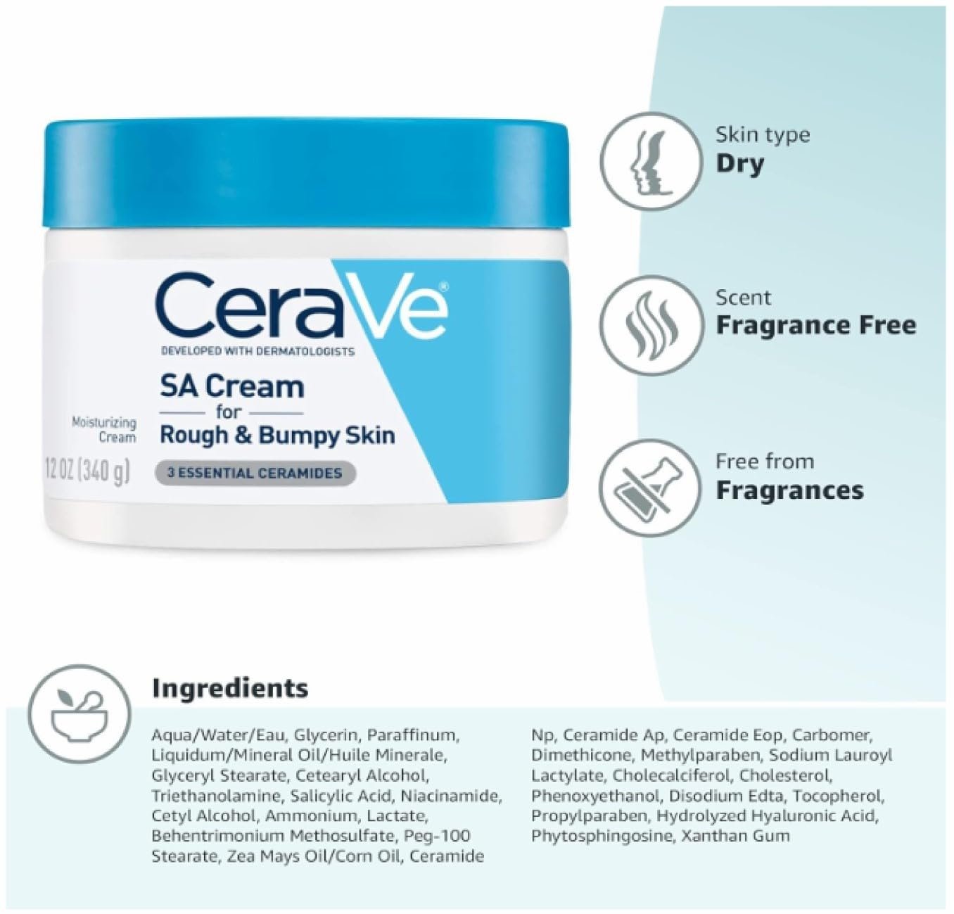 Developed with dermatologists, CeraVe Renewing SA Body Cream for Rough and Bumpy Skin, has a unique formula that exfoliates and moisturizes while helping to restore the protective skin barrier. Salicylic acid exfoliates and softens to smooth rough skin, lactic acid exfoliates to renew skin’s surface and three essential ceramides (1, 3, 6-II) help to restore the protective skin barrier.
