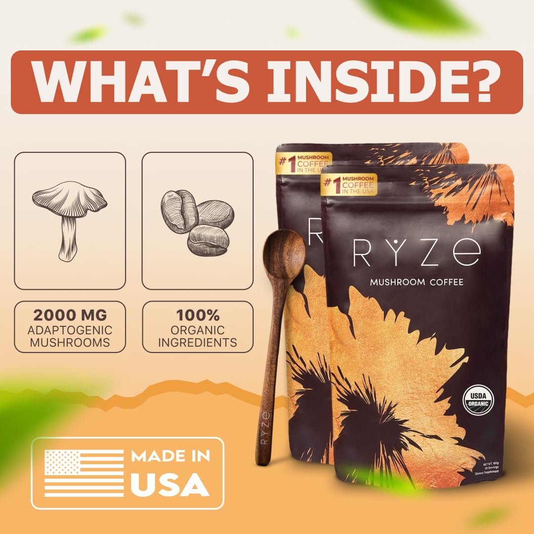 RYZE is the #1 best selling Mushroom Coffee in the world! We are fully organic and use 6 different Adaptogenic Mushrooms, while most brands only use 1-2. Every scoop contains an industry-leading 2000mg of adaptogens and 25%+ beta-glucans