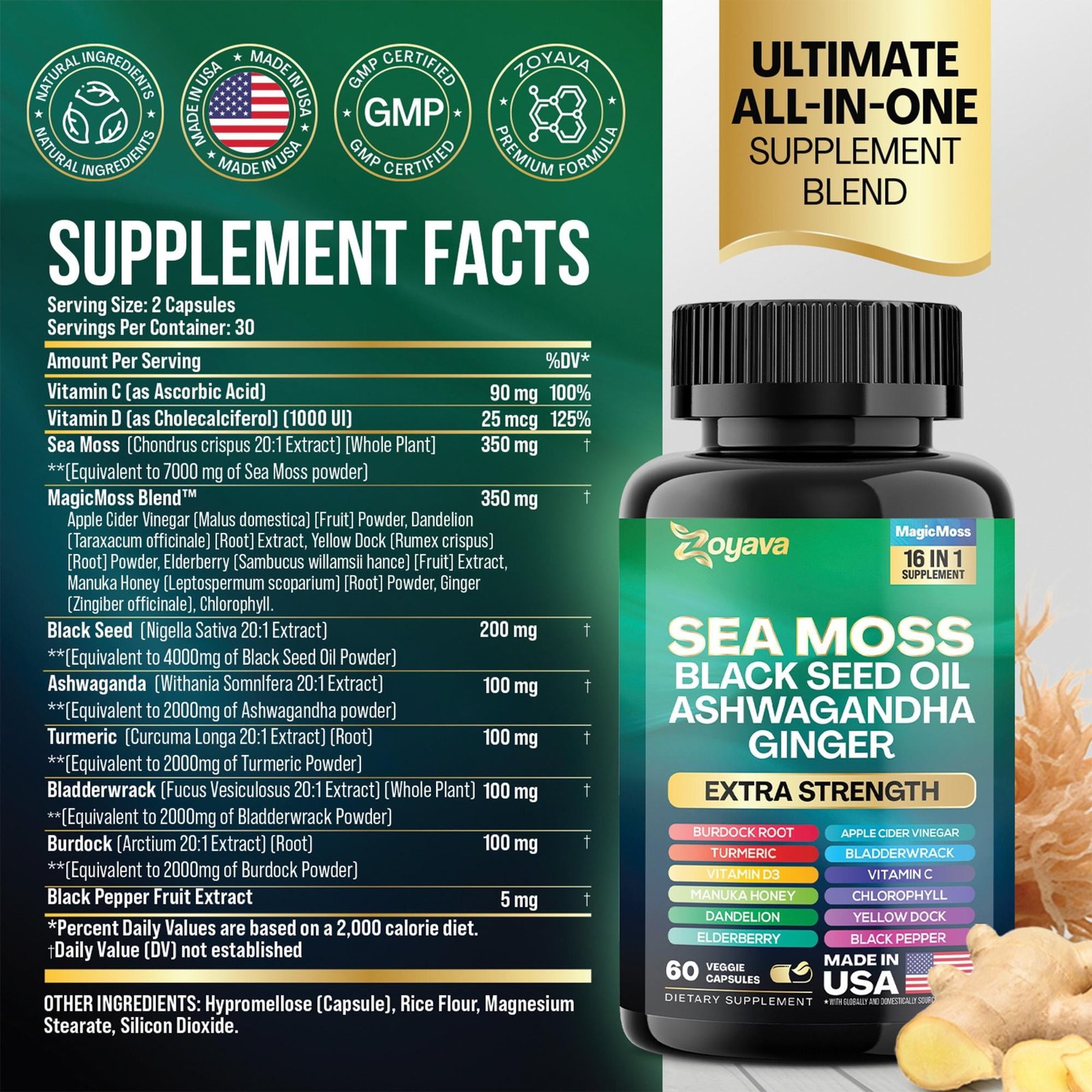 - Our advanced formula of Irish Sea Moss Capsules are designed for both women and men. Our Seamoss Pills, enriched with Black Seed Oil for hair health, contain a remarkable blend of 15 beneficial ingredients, including Turmeric Curcumin Capsules, Bladderwrack capsules, Burdock roots, Chlorophyll, Ginger and more. Zoyava presents the world’s most comprehensive 16-in-1 formula, featuring raw sea moss, black seed, ashwagandha extract, bladderwrack root, burdock roots, ginger and turmeric capsules.